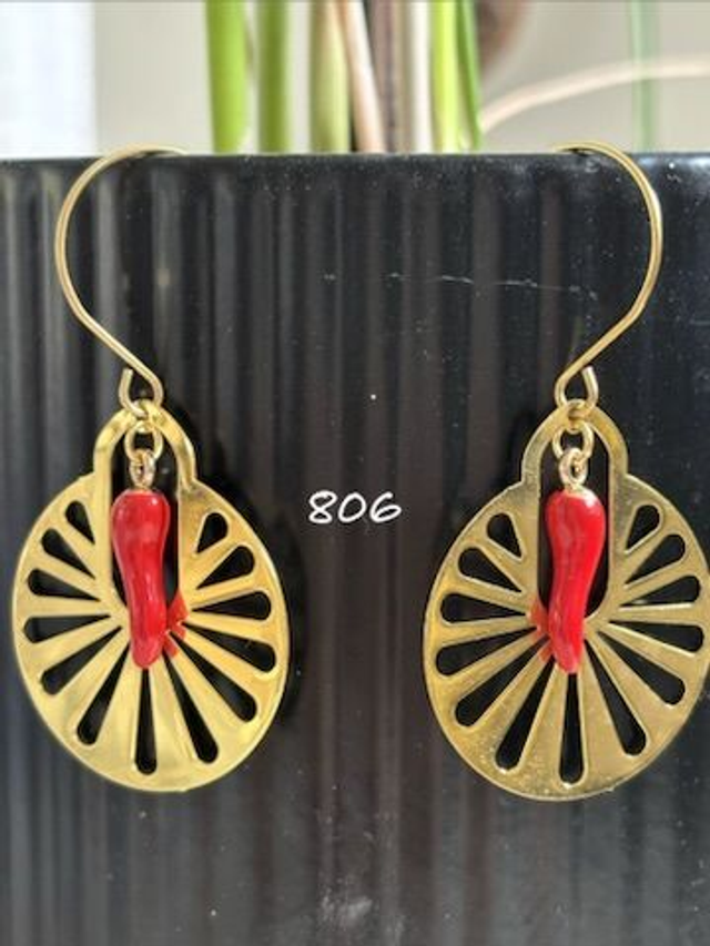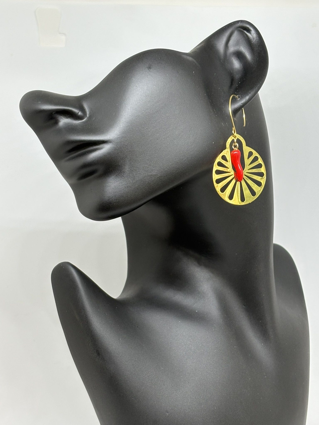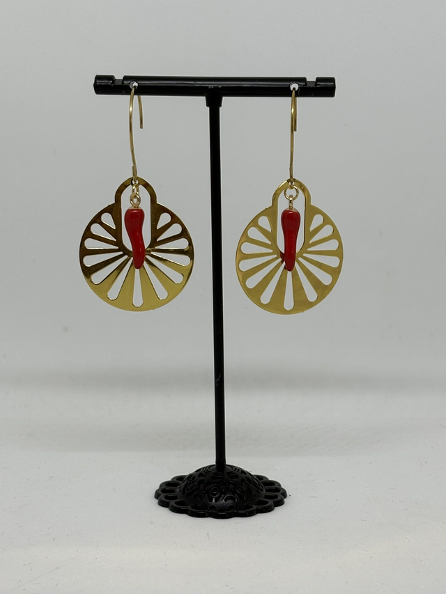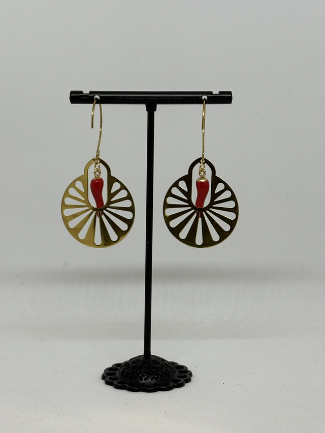 Ces boucles d’oreilles associent une monture dorée ajourée façon soleil et une breloque piment. Un contraste chic et audacieux qui attire tous les regards.